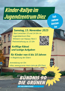 Der Ortsverband von Bündnis 90/Die Grünen lädt für Samstag, den 15.11.2025 zur Kinderrallye in das Jugendzentrum Diez, Wilhelm von Nassau-Park 5. Alle Kinder im Grundschulalter sind herzlich eingeladen, mit Unterstützung ihrer Eltern mitzumachen!